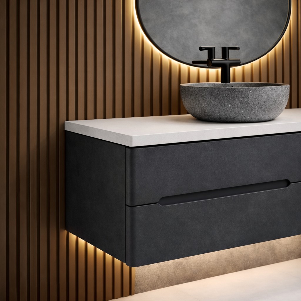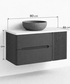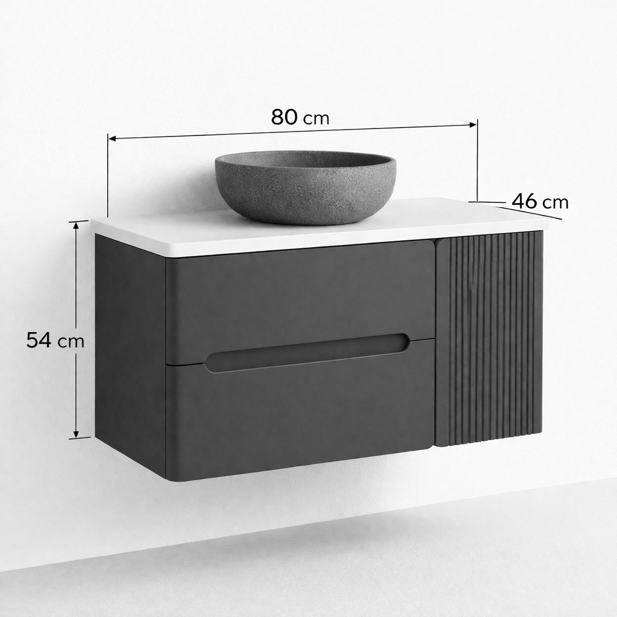 Masca de lavoar Arco 80 este realizată din MDF vopsit cu blat alb din compozit. Are dimensiunea L80 x W46 x H54 cm și poate fi realizată în orice culoare din paletarul RAL și NCS. Personalizabilă la comandă.