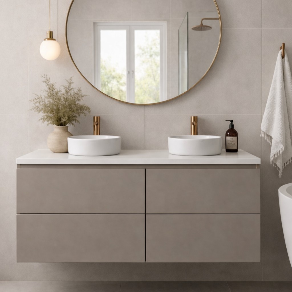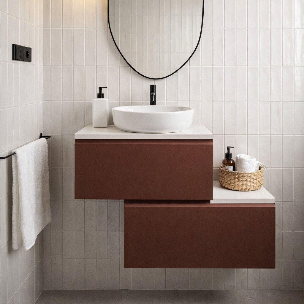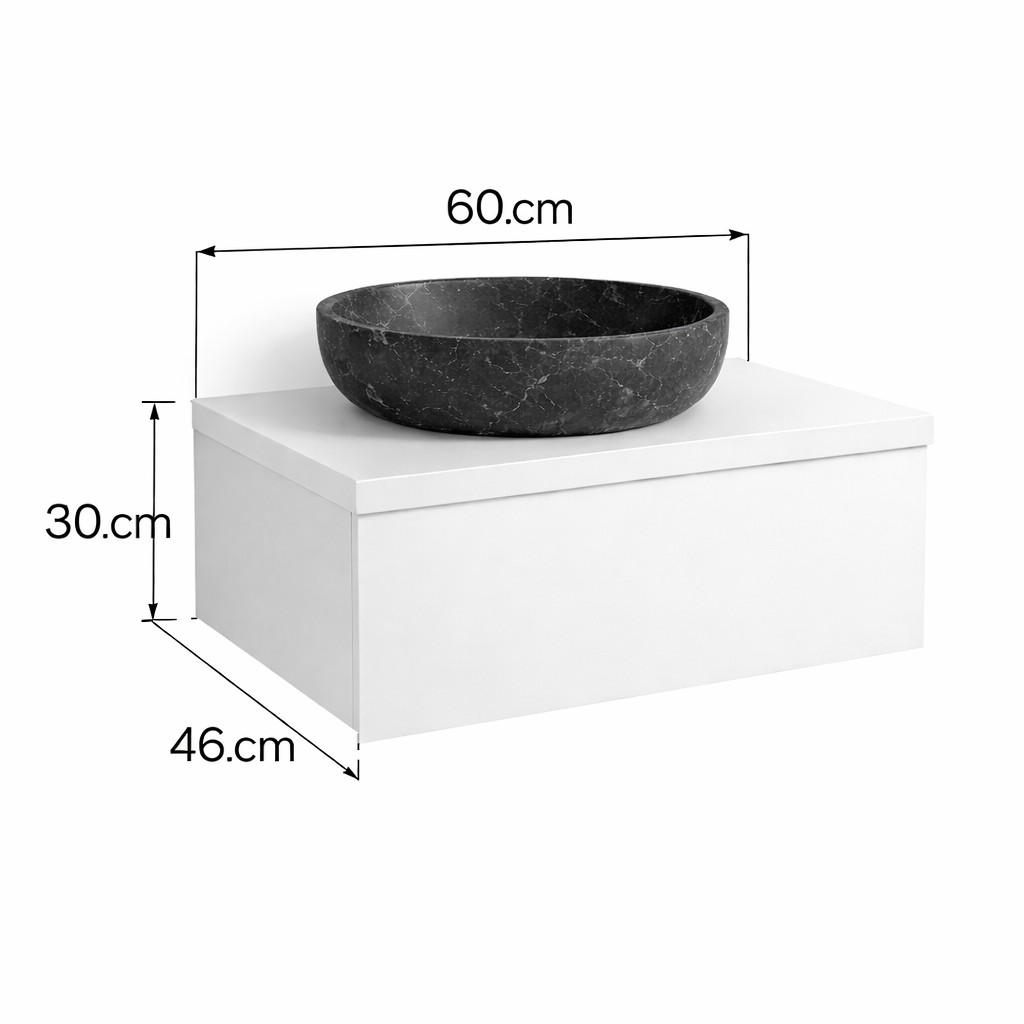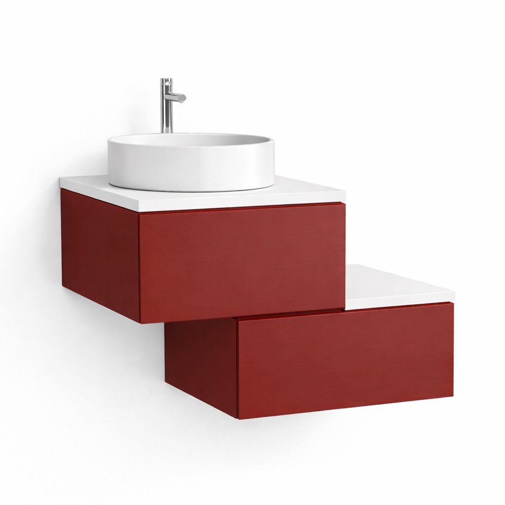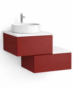 Masca de lavoar Modula este realizată din MDF vopsit cu blat alb de compozit. Are dimensiunea L60 x W46 x H30 cm și poate fi realizată în orice culoare din paletarul RAL și NCS. Personalizabilă la comandă.